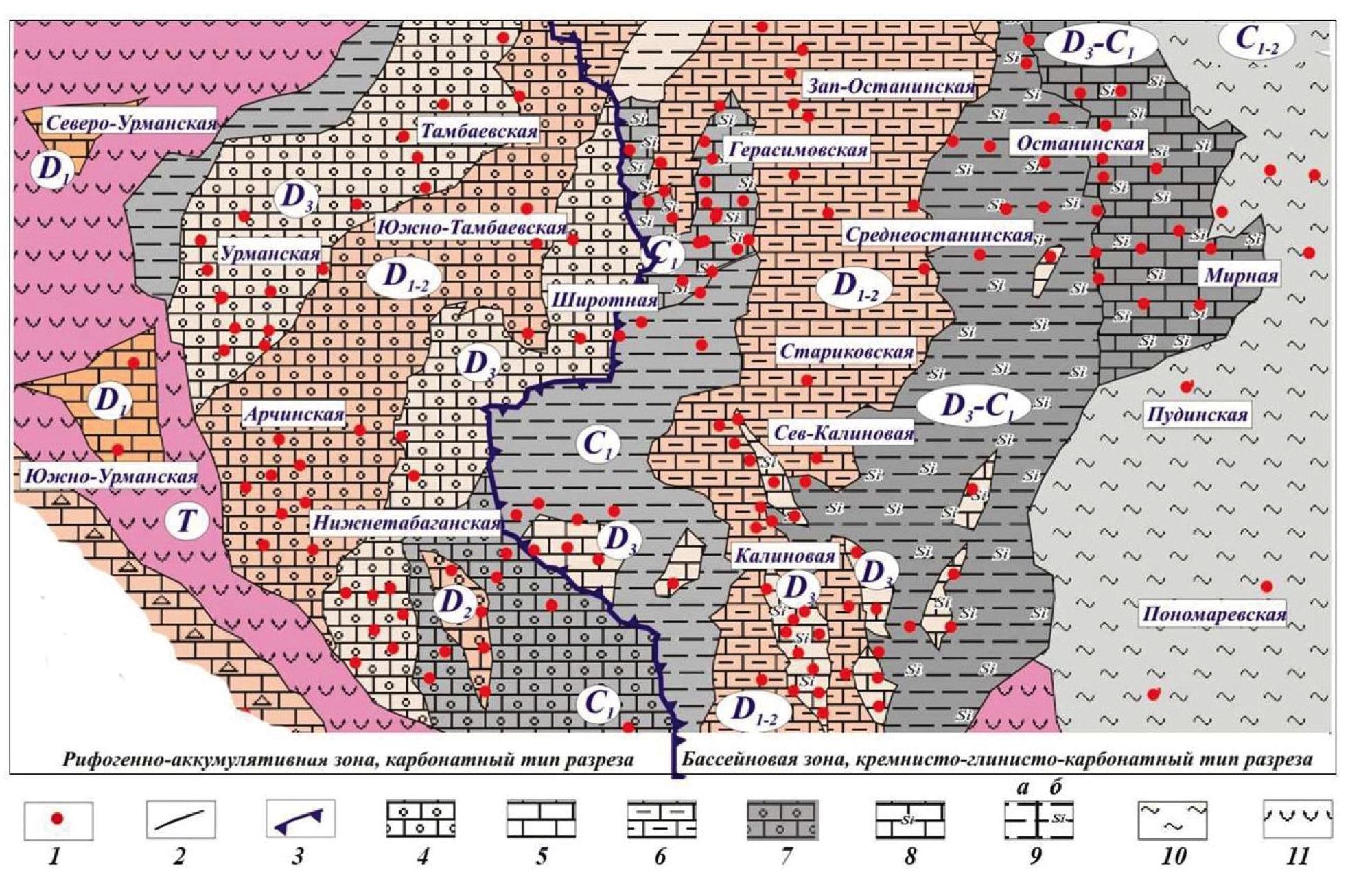 Изучение вещественного состава и палеогеографических условий формирования доюрских образований рассматриваемой территории позволили [3] выделить в Чузикcко-Чижапcкой мезоседловине юго-западную зону преобладающего развития органогенных известняков и северо-восточную и восточную зону кремнисто-глинисто-карбонатных пород (рис. 2).