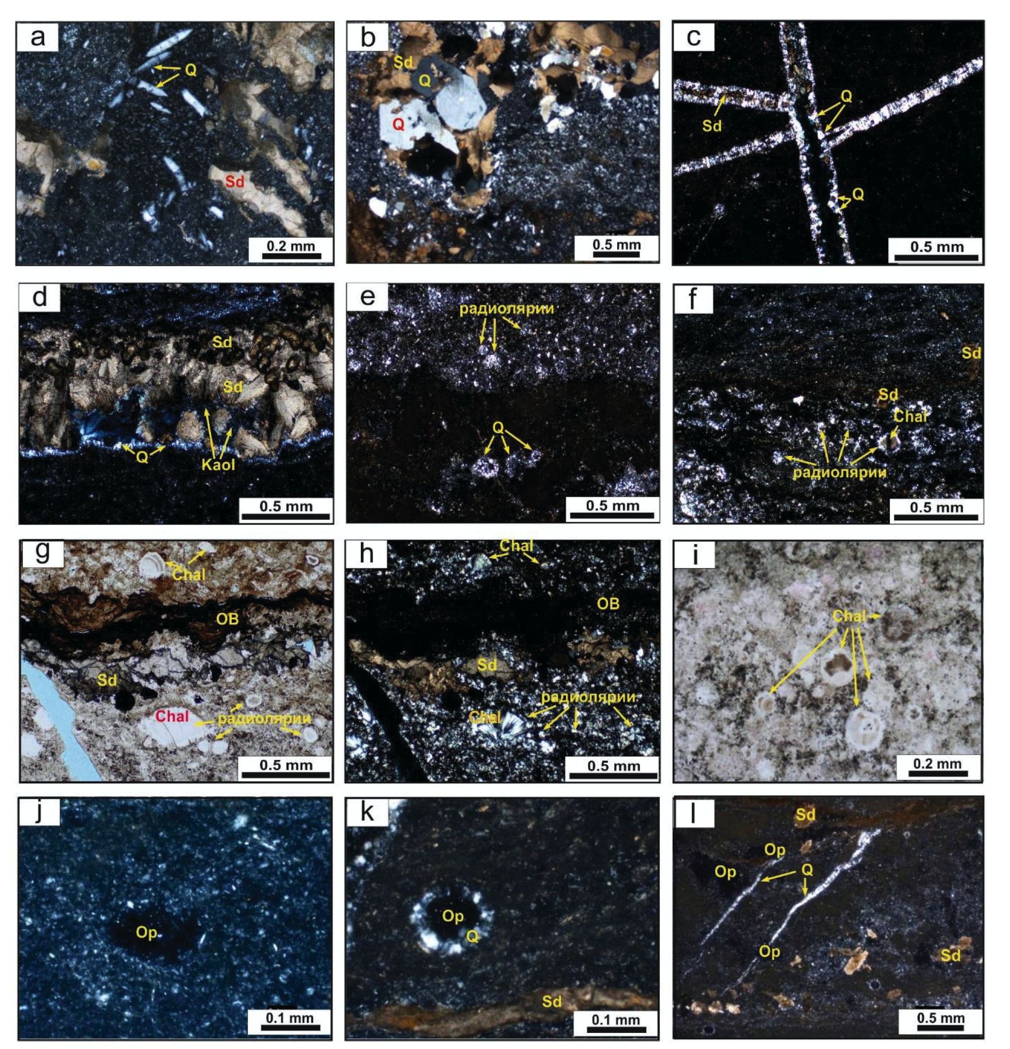 Fig. 5. Silicate group minerals in the M reservoir rocks of the Kalinovoe field: a) elongated prisms of quartz crystals; b) granoblastic quartz aggregate; c, d) columnar quartz crystals along fracture margins; e) microcrystalline authigenic quartz in radiolarian tests; f–i) radial-fibrous chalcedony aggregates, partially ferruginous; j) opal in radiolarian relicts; k) radiolarian replaced by opal and rimmed by microcrystalline quartz; l) opal in dissolution voids, quartz in fractures. Legend: Q – quartz, Chal – chalcedony, Op – opal, Sd – siderite, Kaol – kaolinite, ОВ – organic matter. Arrows indicate radiolarian remains. Photographs a–f, h, j–l with analyzer, g–i without analyzer