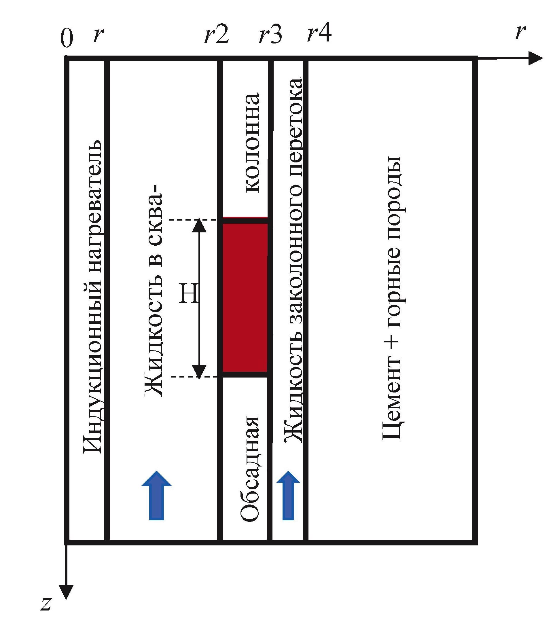 Модель индукционного нагрева обсадной колонны в скважине при наличии вертикального перетока жидкости в заколонном пространстве к пресноводному горизонту (r-z модель)