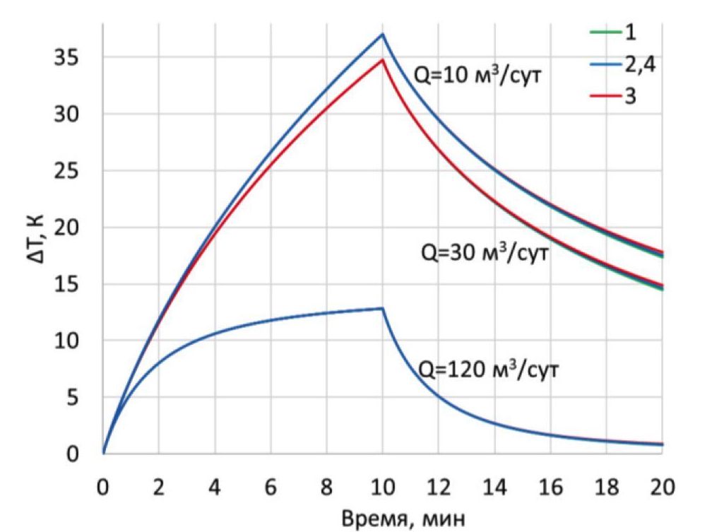 С увеличением расхода жидкости в скважине с 10 до 120 м3/сут режим течения потока переходит от ламинарного к турбулентному (табл. 2), при этом увеличивается интенсивность теплообмена колонны с потоком, а максимальный разогрев колонны снижается с 37,0 до 12,8 К. Благодаря наличию герметичного цементного кольца в пространстве за обсадной колонной (рис. 1), экранирующего влияние плоскопараллельного потока в пласте, значения температуры внутренней поверхности колонны в точках 1–4 близки между собой, максимальная разница температур в точках 1–4 за 20-минутный цикл исследований при всех трех расходах 10–120 м3/сут не превышает 0,5 К.