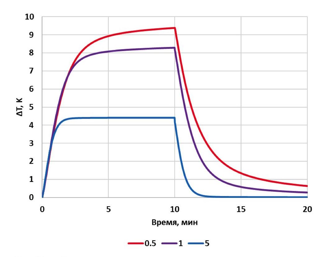 При увеличении расхода заколонного перетока от 0,5 до 5 м3/сут максимальный разогрев колонны снижается с 9,3 до 4,4 К, т. е. более чем в 2 раза. Также при увеличении расхода заколонного перетока возрастает интенсивность охлаждения колонны во времени: если при расходе 0,5 м3/сут через 10 мин после отключения нагревателя остаточный разогрев колонны достигает 0,6 К, то при расходе 5 м3/сут уже в течение 2 мин после остановки нагрева разогрев колонны снижается практически до нулевого значения. Вышеперечисленные особенности температурного поля показывают информативность метода активной термометрии применительно к выявлению заколонных перетоков жидкости в интервалы пресноводных горизонтов.