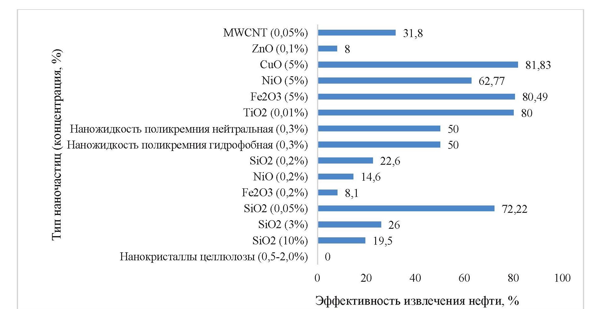 По результатам экспериментов в лабораторных условиях при заводнении образцов керна получены значения эффективности извлечения нефти наночастицами различного состава (рис. 3), наилучший результат показали наночастицы SiO2, CuO, Fe2O3, TiO2 [18].
