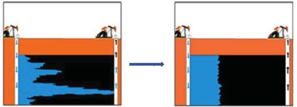 Благодаря образованию на границе нефть–вода тонкой пленки из наночастиц при заводнении наножидкостью возникает локальное повышение вязкости по причине увеличения удельного количества частиц межфазной области. Следовательно, достигается более высокий коэффициент подвижности за счет макроскопического перемещения нефти по модели поршневого вытеснения (рис. 4) [40].