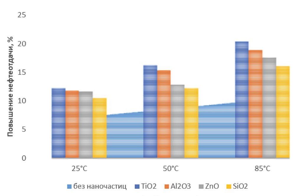 Рис. 8. Дополнительная добыча нефти с применением наночастиц в различных температурных условиях [60]