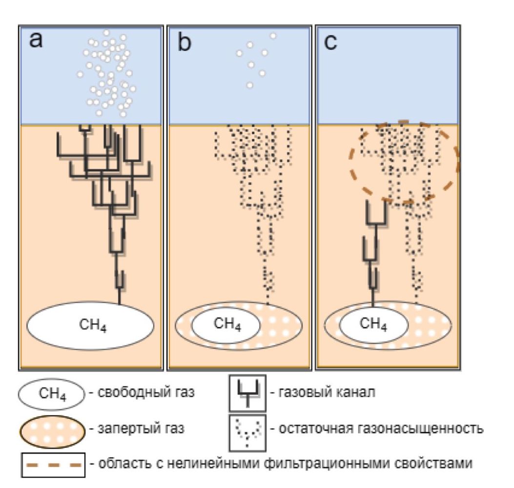где – абсолютная проницаемость среды; – относительная фазовая проницаемость по газу с насыщенностью ; – вязкость газа. Считая мД, , сП, можно получить оценку величины скорости фильтрации м/с. Это эквивалентно массовому потоку газа порядка 0,15 кг с квадратного метра в сутки (для метана с плотностью кг/м3). Характерные потоки газа, регистрируемые в местах разложения метановых газогидратов Восточно-Сибирского Арктического шельфа, на несколько порядков меньше –1–100 мг с квадратного метра в сутки [2, 16]. Это позволяет предположить, что установившийся транспорт газа должен осуществляться по отдельным каналам, соединяющим область накопления газа и поверхность дна (рис. 1, а), причём доля среды, занятая газовыми каналами, должна быть невелика – порядка 10–3. Устойчивость каналов должна определяться соотношением скорости накопления свободного газа и минимальной скоростью фильтрации uг в самом канале. Если приток газа в результате разложения гидрата достаточно мал, газовые каналы могут существовать только ограниченное время, определяемое оттоком газа через канал. После прекращения поступления газа под действием капиллярных сил на месте газового канала может образовываться область среды с остаточной газонасыщенностью, содержащая изолированные (то есть потерявшие связь с источником) объёмы жидкой и газовых фаз (рис. 1, б). Существуют свидетельства, что даже небольшая доля газа может существенно повлиять на фильтрационные свойства среды [17]. На определённом масштабе рассмотрения, учитывая приведённые выше оценки, область с изолированным газом может считаться непроницаемой при градиентах давления ниже величины, определяемой капиллярным эффектом. Это может существенным образом повлиять на последующий транспорт газа, так как при увеличении давления в области разложения гидрата должны будут возникнуть новые пути транспорта, развивающиеся вне области с измененными фильтрационными свойствами (рис. 1, с).