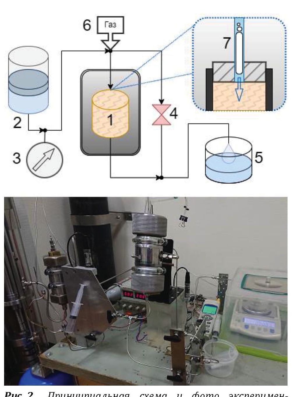 Рис. 2. Принципиальная схема и фото экспериментальной установки: 1 – исследуемый образец в кернодержателе; 2 – гидроаккумулятор; 3 – датчик порового давления; 4 – клапан для выравнивания давления; 5 – весы для измерения массы жидкости, прошедшей через образец; 6 – точка инжекции газа; 7 – пузырёк газа поступает по трубке в образец