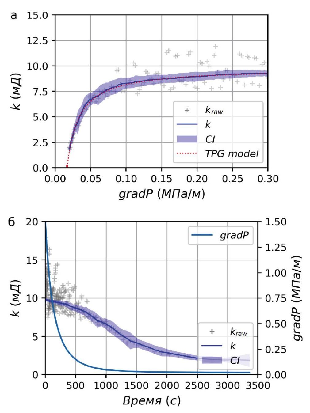 Fig. 3. Effective permeability of the sample no. 2 during the pressure decline test, gas fraction in the pores sgas=0.03; (a) dependence of effective permeability on pressure gradient: kraw – raw data calculated using the central difference method for the derivative of liquid mass on the scales; k – curve obtained using quadratic deviation regularization; CI – 95% confidence interval for k estimate; TPG – result of approximating with the model dependence (1); (б) the same curves plotted against time, the solid line indicates time dependence of pore pressure gradient