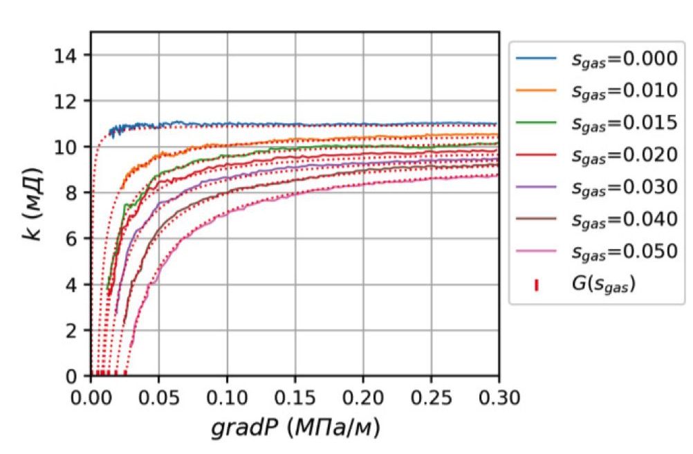 В ходе работы было испытано три идентичных искусственных образца и суммарно проведено около 70 опытов, по несколько опытов с каждым значением газонасыщенности. Результаты измерений представлены в табл. 2. На рис. 4 показано, как менялась зависимость эффективной проницаемости k образца № 2 от градиента порового давления gradP для различных величин газонасыщенности sgas. Пунктирными линиями обозначены модельные кривые вида . В качестве величины порогового градиента G для данной газонасыщенности взята точка пересечения соответствующей модельной кривой с осью абсцисс.