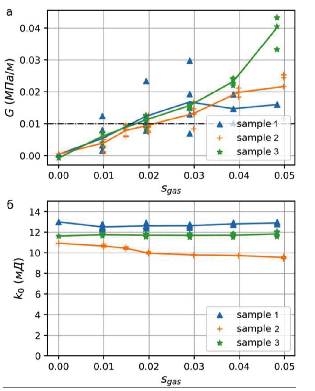 Рис. 5. Параметры модели порогового градиента для всех проделанных опытов: a) зависимость величины порогового градиента G от газонасыщенности sgas, сплошными линиями показаны средние значения для каждого образца; пунктирной линией отмечена величина гидростатического градиента; б) зависимость абсолютной проницаемости k0 от газонасыщенности sgas