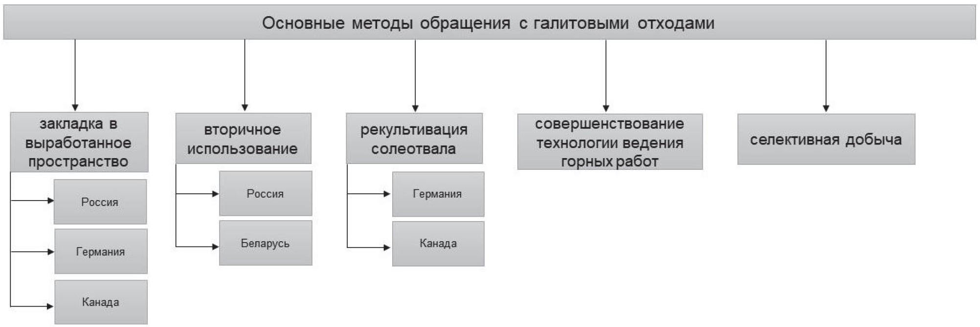 Results. The research considers the geographical distribution of potash deposits and presents the characteristics of potash mining waste using the example of the Verkhnekamskoe Potash Deposit. The paper provides both domestic and foreign analyses of ecological consequences of waste storage on the day surface. Several options for potash mining waste management are analysed. For the management of clay-salt slurry, the most effective approach is its injection into underground horizons, which includes the use of saturated solutions as a fertiliser component, as a part of a product in construction, and in the oil industry. A more comprehensive approach to halite waste management is needed. Waste disposal to waste dumps is relevant due to the presence of mined-out areas on the territory of long-operating enterprises. Reclamation of the salt dump will help to isolate it from atmospheric precipitation, thereby reducing the inflow of saturated water into the environment. Utilising waste for production of construction materials is the most economically and environmentally favourable option. Extracting valuable components, producing fertilisers, concentrates, etc. from waste is the least practical approach due to the ecological and economic expenses involved in acquiring extraction equipment and the repeated generation of waste. The most challenging aspect of reducing waste generation in terms of technology lies in improving mining operations and implementing selective mining.