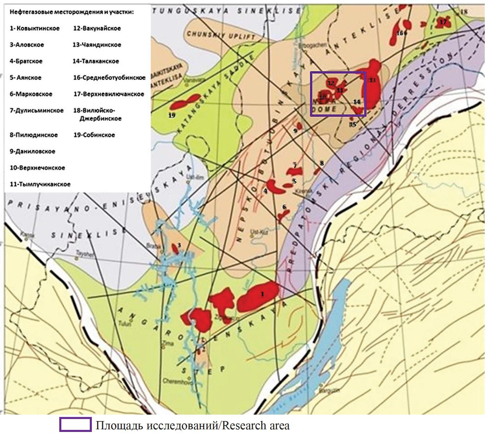 Fig. 4. Structural-tectonic diagram of the location area of the major oil and gas fields in Eastern Siberia [20, 21]