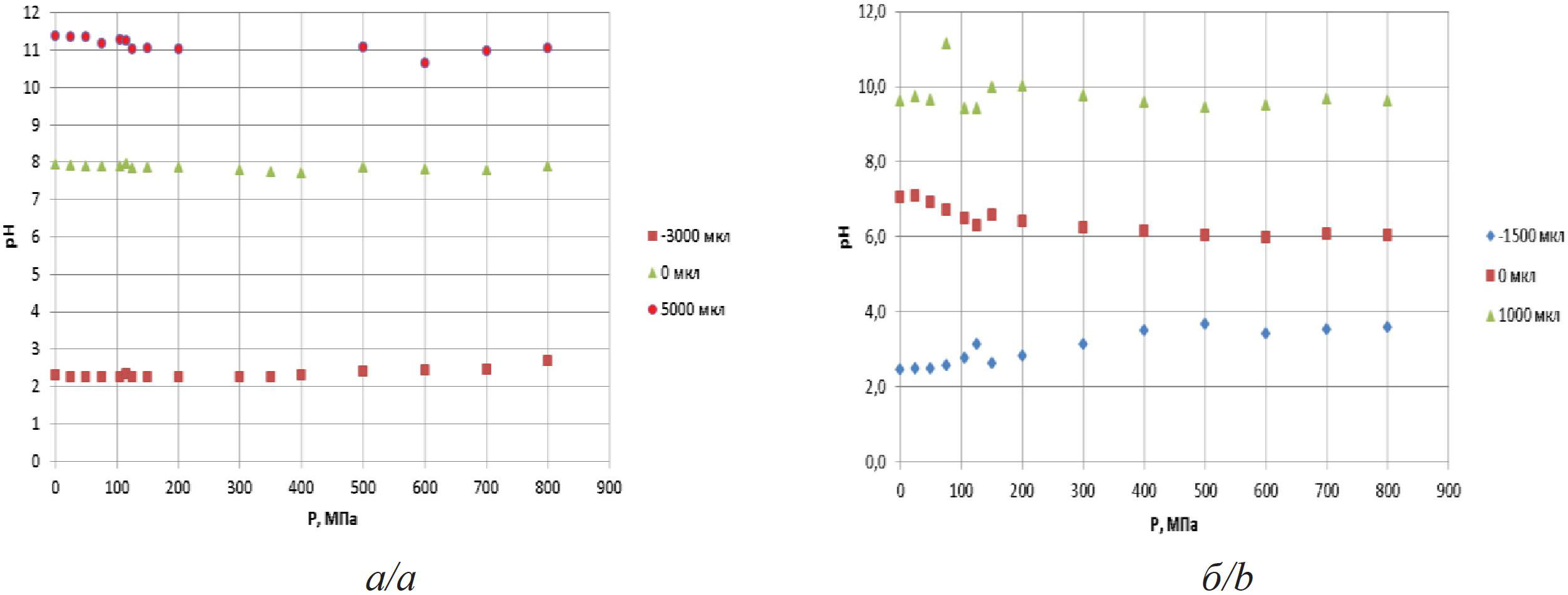 По данным значений рН в зависимости от объема титранта для каждого давления Р=0–800 МПа строились кривые титрования суспензий в программе SigmaPlot и определяли значение ТНЗ.