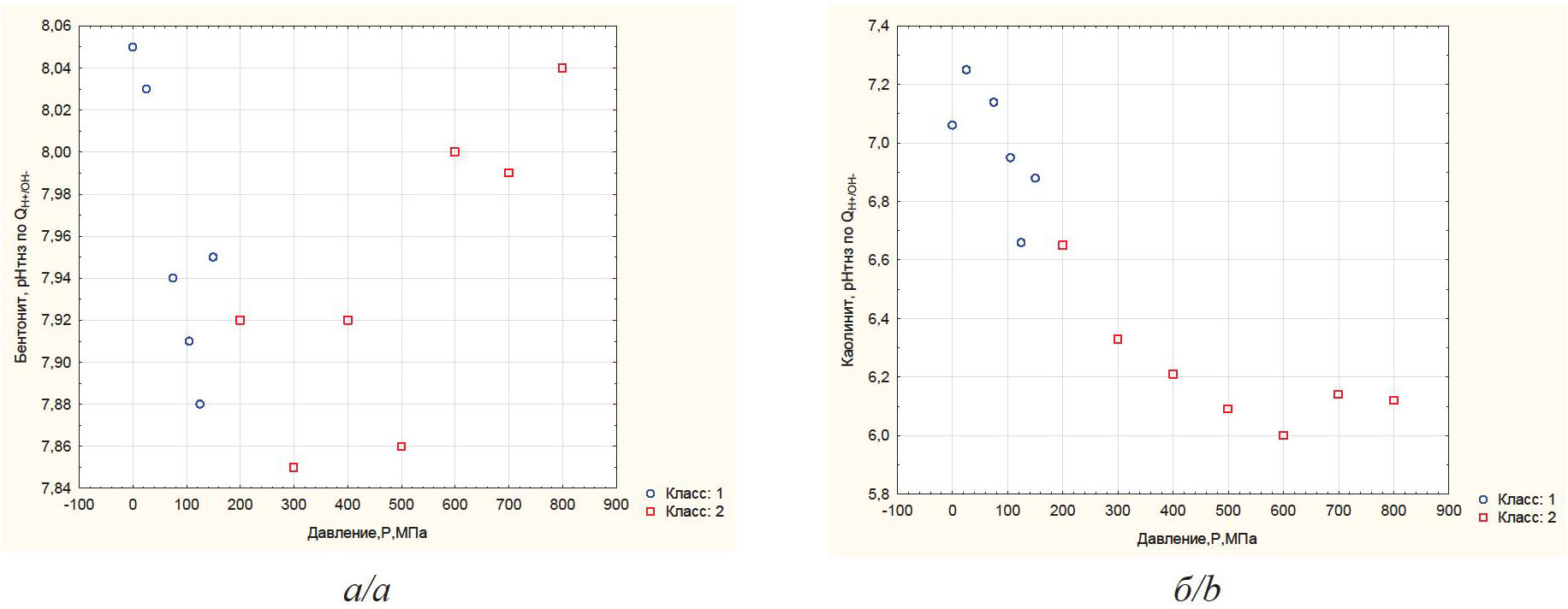 Из рис. 6 видно, что рН ТНЗ бентонитовой глины снижается при давлениях до 150–200 МПа (класс 1) и возрастает при Р=200–800 МПа (класс 2). рН ТНЗ каолиновой глины снижается как при давлениях до Р=150–200 МПа (класс 1), так и при Р=200–800 МПа (класс 2). Обоснование граничного значения Р=150–200 МПа приведено в работе [35].
