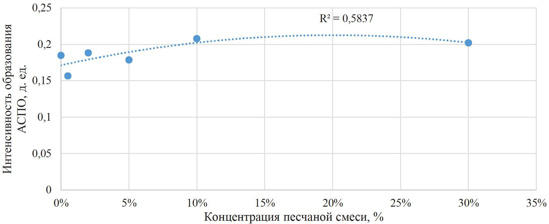 В результате выполнения первой серии исследований, представленной в табл. 2, была составлена точечная зависимость интенсивности образования АСПО от концентрации песчаной смеси с равной пропорцией фракций в нефти. Данная зависимость приведена на (рис. 2).
