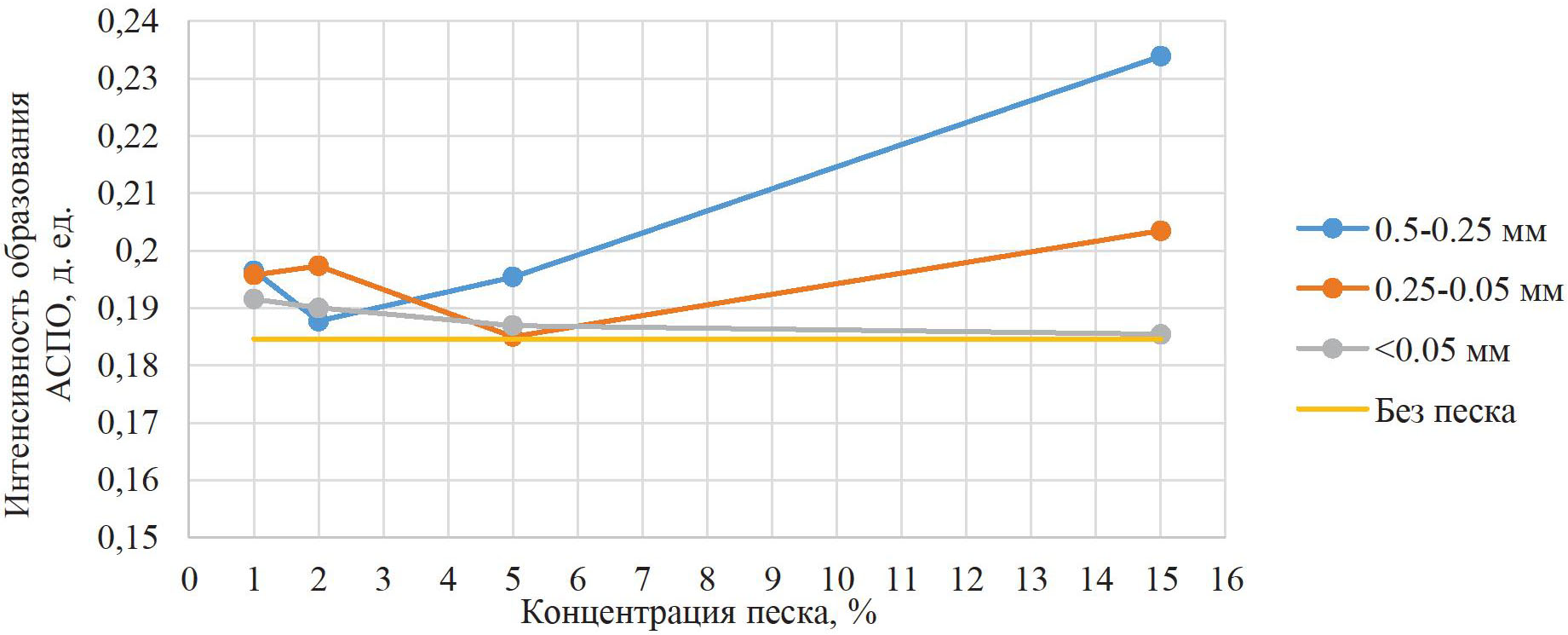 Анализируя полученный график, можно отметить, что увеличение концентрации фракций песка диаметром до 0,05 мм не приводит к увеличению интенсивности образования отложений. При этом добавление частиц песка диаметрами 0,25–0,05 и 0,5–0,25 мм с концентрацией более 5 % приводит к увеличению интенсивности образования органических отложений.