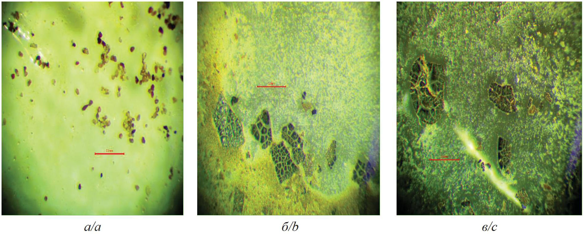 5. Fig. 4. Images of dissolved asphalt-resin-paraffin deposits obtained during the series of studies No. 2 for a fraction: a) <0.05; b) 0.25–0.05; c) 0.5–0.25 mm