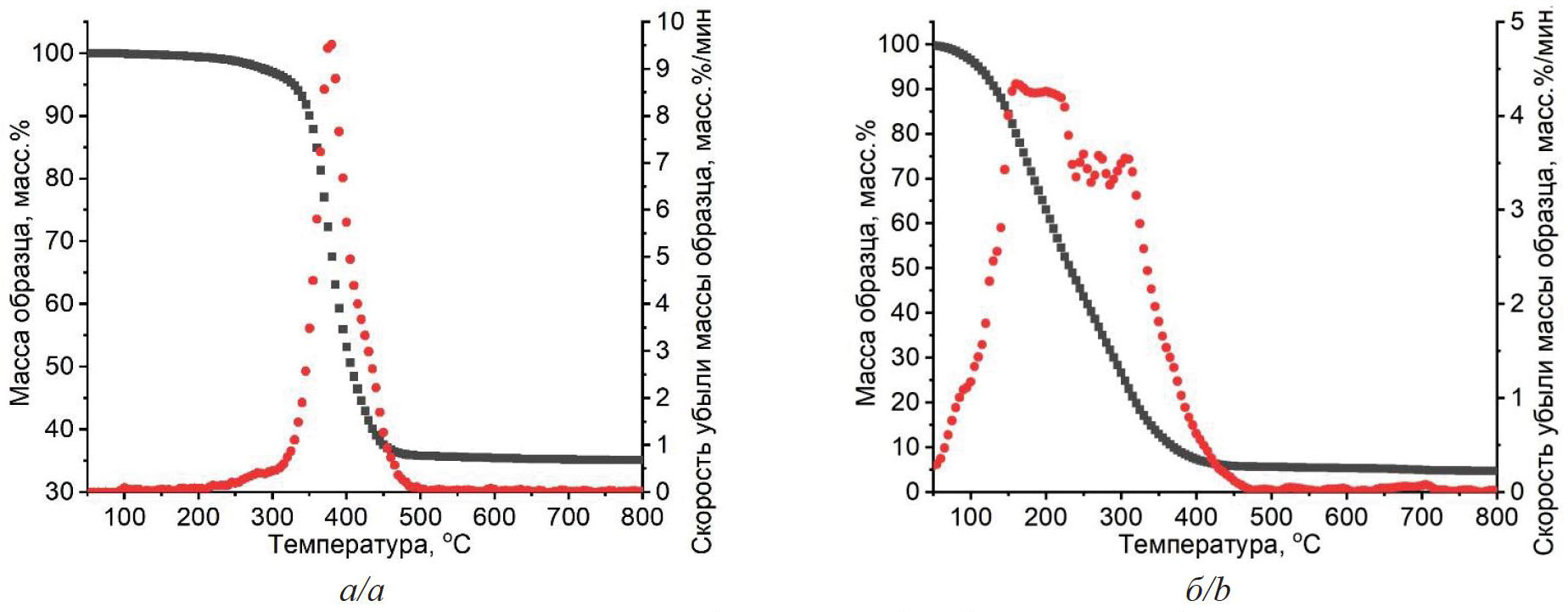Рис. 1. ТГ и ДТГ кривые пиролиза (a) и окисления (б) пиролизной жидкости переработки резинотехнических изделий (■ – масса образца, ● – скорость убыли массы образца)