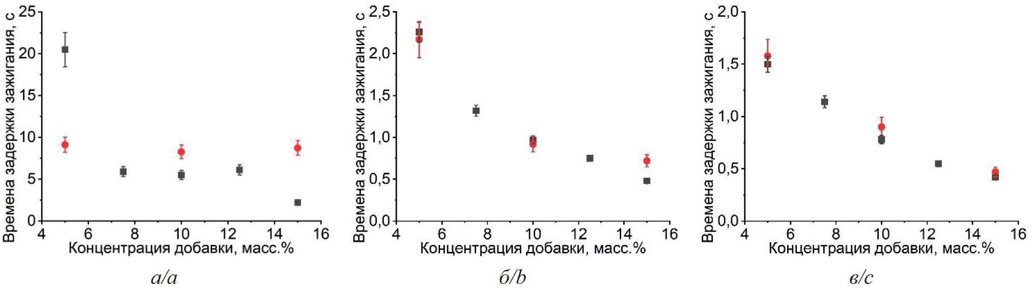 Во всем исследованном диапазоне температур греющей среды наблюдалось относительно линейное снижение времен задержки зажигания при увеличении концентрации добавки и температуры греющей среды. Исключением является образец с 5 мас. % добавки пиролизной жидкости, приготовленный методом равномерного смешения при 600 °С, что связано с недостаточным тепловыделением при горении добавки, не позволяющим инициировать зажигание образца. Практически постоянные времена задержки зажигания при 600 °С для образцов, приготовленных методом поверхностного смачивания, свидетельствуют о том, что полученные значения в большей степени характеризуют поведение пиролизной жидкости, а не смеси. Аналогичное поведение наблюдается и для образцов, приготовленных методом равномерного смешения, в диапазоне концентраций добавки 7,5–12,5 мас. %. Полученные результаты хорошо коррелируют с литературными данными [23, 24], свидетельствующими о более сложном характере поведения аналогичных смесей при низких температурах, определяемых процессами испарения и диффузии жидкофазной компоненты.