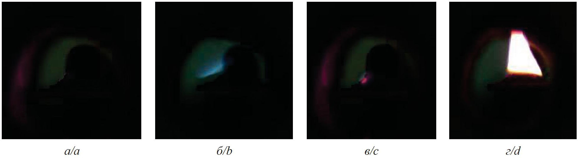 Рис. 3. Характерные кадры зажигания (а, б) и горения (в, г) образцов, приготовленных методами равномерного смешения (а, в) и поверхностного смачивания (б, г) при 600 °С