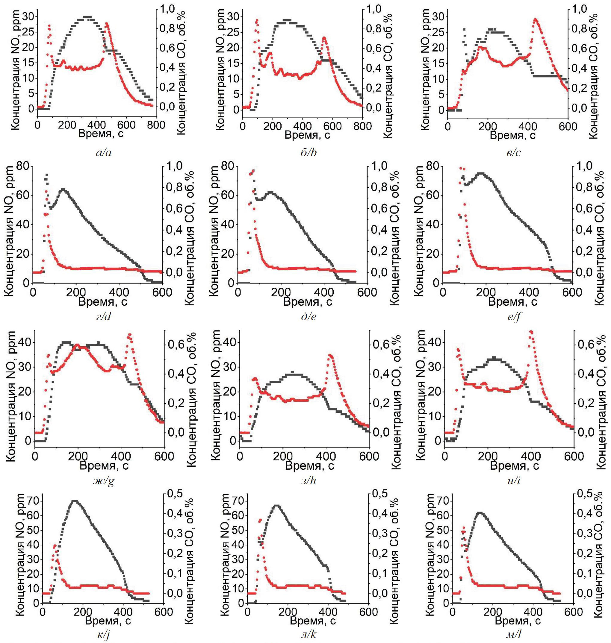 Рис. 4. Концентрационные кривые выделения CO и NO при горении смесей низкосортного угля с пиролизной жидкостью при 600 °С (а, б, в, ж, з, и) и 800 °С (г, д, е, к, л, м), приготовленных методами равномерного смешения (а–е) и поверхностно пропитки (ж–м), при различной концентрации компонент: 5 мас. % – а, г, ж, к; 10 мас. % – б, д, з, л; 15 мас. % – в, е, и, м (■ – концентрация NO, ● – концентрация СО)