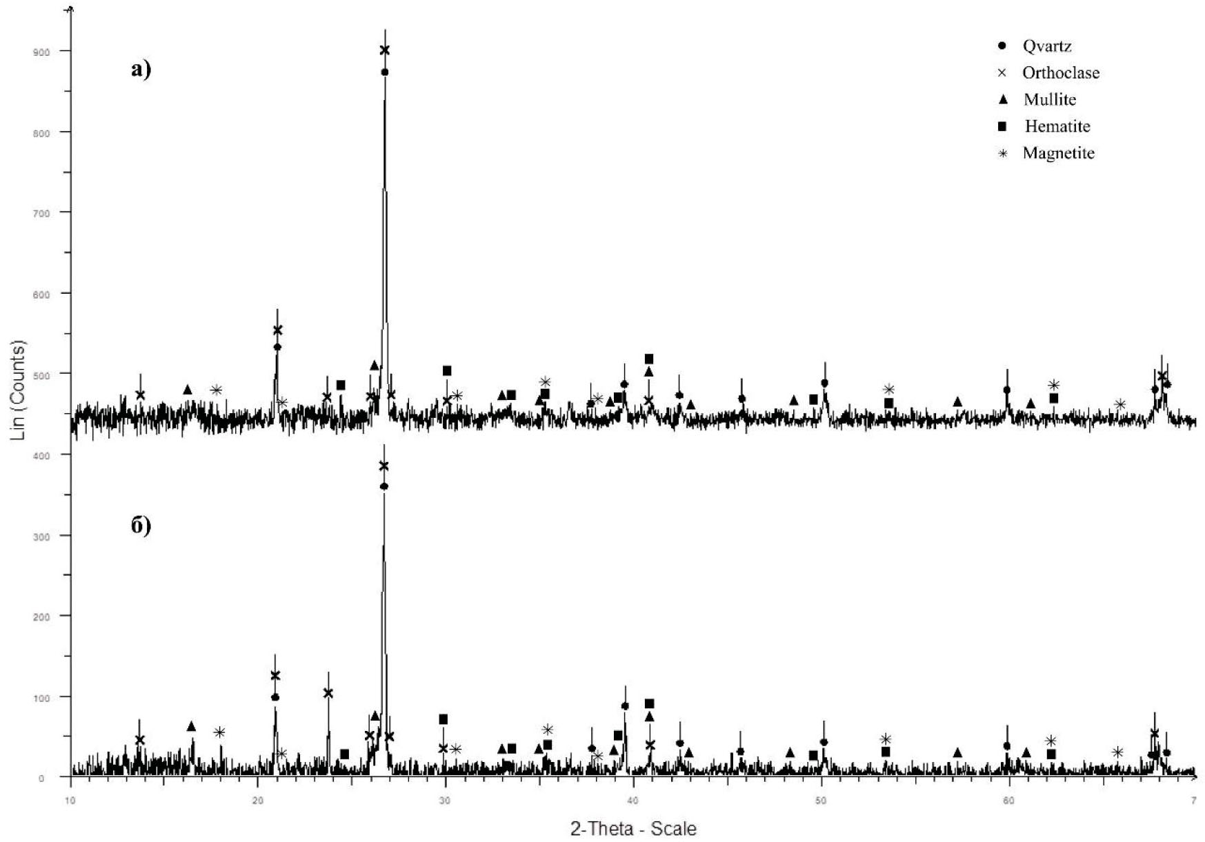 По результатам РФА на рентгенограммах золошлаковых отходов присутствуют интенсивные пики кварца. Кроме того, зафиксированы рефлексы небольшой интенсивности, относящиеся к соединениям железа (гематит и магнетит), муллиту, а также минералов группы ортоклаза. Надо отметить, что содержание фаз с железом немного больше в образцах ЗШО ТЭЦ-1.
