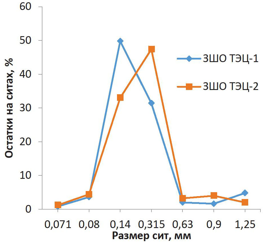 Гранулометрический состав показывает, что золошлаковые отходы ТЭЦ-1 более мелкие, чем отходы ТЭЦ-2. Частицы размером более 0,315 мм составляют в них 39,8 и 56,6 % соответственно. При этом ЗШО ТЭЦ-1 содержат большее количество частиц размером более 1,25 мм и менее 0,071 мм.