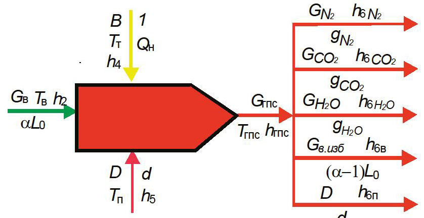 В·Qн·hкс+Gв·h2+В·h4+D·h5=Gгпс·hгпс==GN2·h6N2+GCO2·h6CO2+GH2O·h6п+Gв.из·h6в+D·h6п,