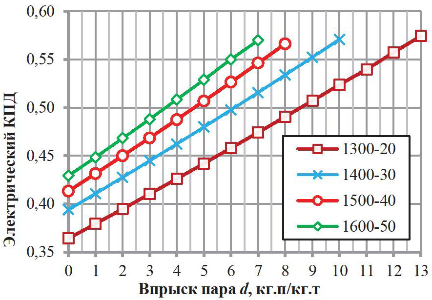 Рис. 4. Электрический коэффициент полезного действия в зависимости от относительного расхода пара, температуры газопаровой смеси за камерой сгорания и степени сжатия в компрессоре