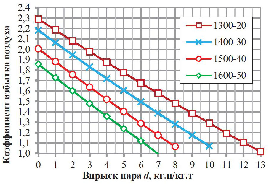 - относительный расход пара в КС d, кг/кг топлива: 0…13;