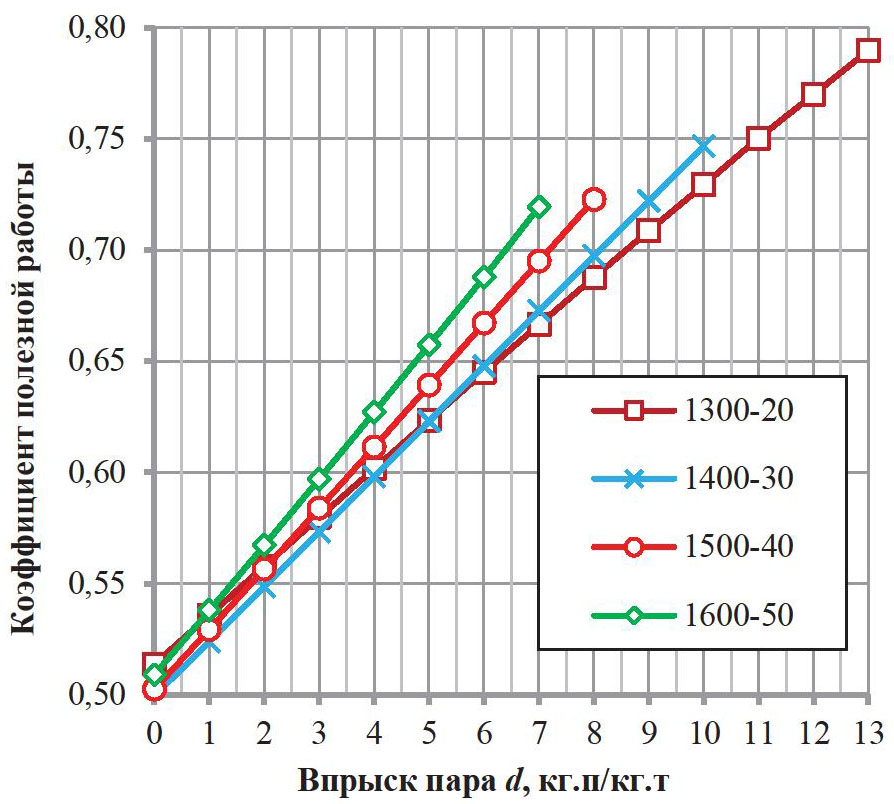 - коэффициент полезной работы сильно зависит от относительного расхода пара в камеру сгорания, температуры газопаровой смеси за ней и степени сжатия в воздушном компрессоре, с ростом этих параметров он линейно возрастает;