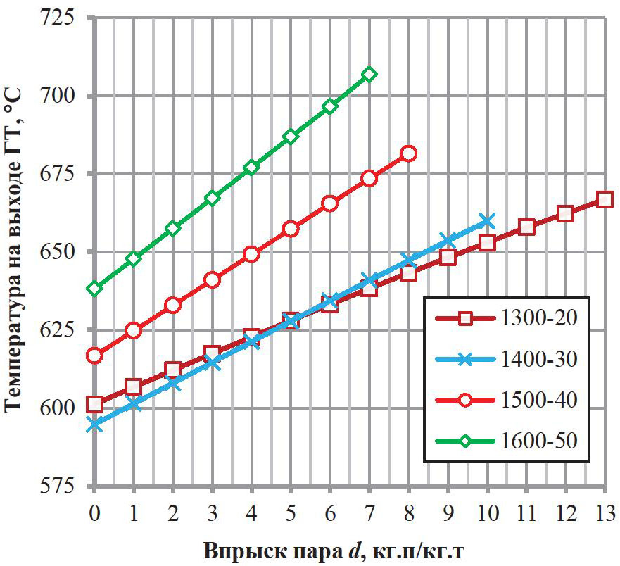 На рис. 7 показана зависимость температуры газопаровой смеси на выходе ГТ от d. С увеличением d температура газопаровой смеси на выходе ГТ линейно возрастает. Для варианта 1 от 600 до 665 °С, для варианта 2 от 595 до 660 °С, для варианта 3 от 620 до 680 °С и для варианта 4 от 630 до 700 °С.