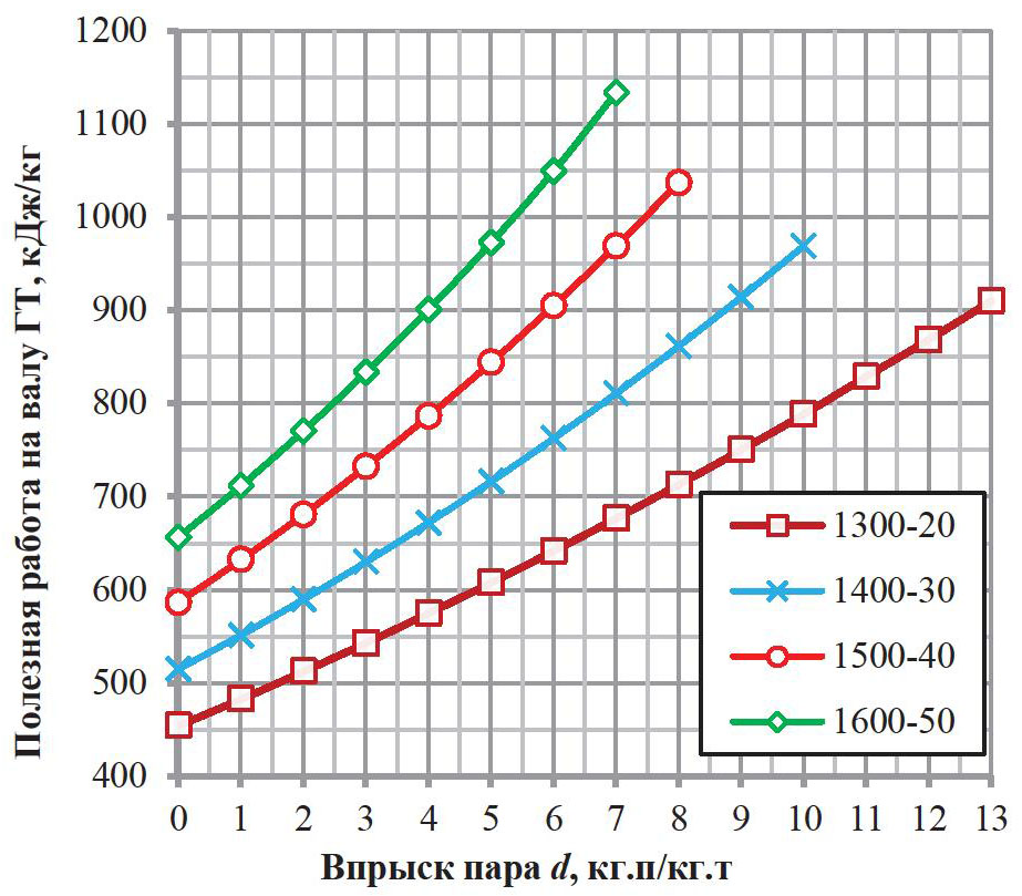 Зависимость полезной работы на валу ГТ от d приведена на рис. 8. С увеличением d полезная работа на валу ГТ возрастает по ветви параболы. Чем больше температура газопаровой смеси за КС и степень сжатия в ВК, тем круче ветвь параболы, но меньше диапазон изменения d. Для варианта 1 полезная работа на валу ГТ возрастает в допустимом диапазоне изменения d в 2 раза – от 450 до 900 кДж/кг; для варианта 2 в 1,9 раз – от 510 до 975 кДж/кг; для варианта 3 в 1,8 раз – от 580 до 1045 кДж/кг; для варианта 4 в 1,7 раз – от 655 до 1130 кДж/кг.