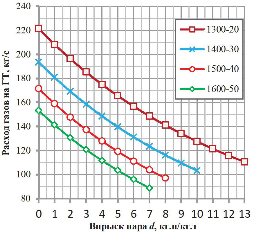 Рис. 9. Расход газов на газовую турбину в зависимости от относительного расхода пара, температуры газопаровой смеси за камерой сгорания и степени сжатия в компрессоре