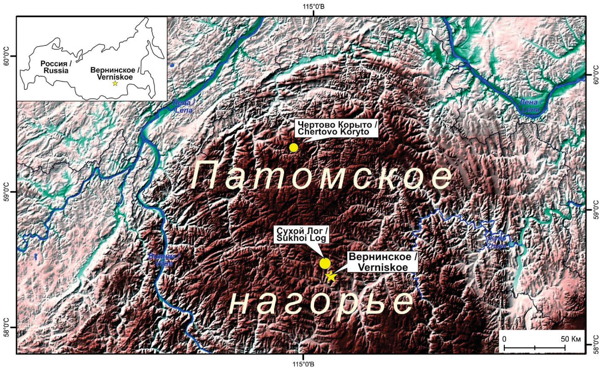 Fig. 1. Location diagram of study objects (deposits: Verninskoe, Sukhoi Log, Chertovo Koryto) within the Patom Highlands