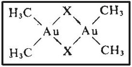 Плоская квадратная – плоскостные связи Flat square – planar connections | Метилгалогенидные – общая формула цис- Methyl halide – general formula cis- [(CH3)2AuX2] [(CH3)2AuCl]2 | 571, 561, 550, 545 | |