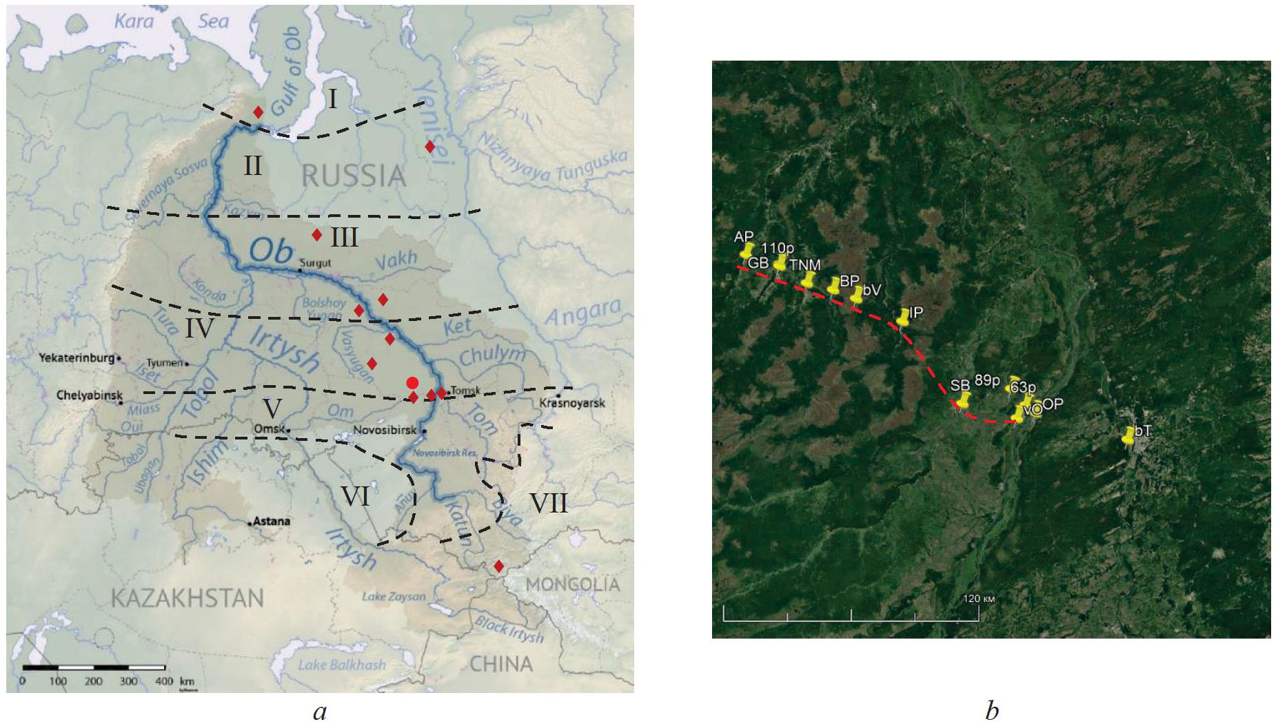 Fig. 1. Scheme of the Ob basin (a) and location of the modeling profile for changes in groundwater levels in the Holocene (b; calculation using equations (1)–(3)); natural areas in the river basin Ob: I – tundra; II – forest-tundra and northern taiga; III – middle taiga; IV – southern taiga; V – forest-steppe; VI – steppe; VII – mountainous areas (Scheme a is given after [33]); · – the area where the main research objects are located in the area of the AP–OP profile (b), which passes through the posts: AP is the Andarma river at the Panychevo village; GB is the Galka river at the Bakchar village; TNM is the Teterenka river at the Novo-Makarovka tract (non-residential place); BP is the Bakchar river at the Polynyanka village; IP is the Iksa river at the Plotnikovo village; SB is the Shegarka river at the Babarykino village; OP is the Ob river at the Pobeda village; TPU observation areas in swamps: bV is the eastern part of the Vasyugan swamp between the Polynyanka village and Gavrilovka tract; bO is the part of the Ob fen near the villages of Nashchekovo (background) and Melnikovo (polluted area) villages; bT is the swamp near the Timiryazevo area; hydrogeological wells: 63p is the Melnikovo village; 89p is the Kargala village; 110p is the Bakchar village; - - - - is the position of the calculated profile of groundwater levels calculated using equations (1)–(3) (based on Google Earth image); ¨ – the additional research objects