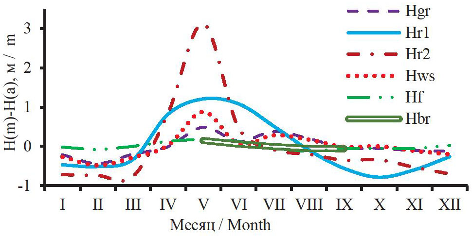 Fig. 3. Intra-annual changes in deviations of average monthly water levels H(m) from their average long-term values H(a); water levels: Hgr is in the well 89р (Kargala village; sediment age aQIItb; average level for 1965–1995 Hgr(a)=99.39 m; wellhead elevation 109.40 m); Hr1 is the water level of the Ob River near the Pobeda village (average for 1967–2015 Hr1(a)=72.76 m); Hr2 is the water level of the Shegarka River near the Babarykino village (average for 1967–2005 Hr2(a)=89.91 m); Hws is the calculated groundwater level at the watershed of the Ob and Shegarka rivers (Hws(a)=102.00 m with an average distance of the watershed from the Ob River of 23.8 km with elevations of 115–120 m); Hf is the water level in the Baksinskoe swamp (well 104, sedge-reed hummock; on average for 1961–1969 Hf(a) = 140.84 m with an average height of the swamp surface of 141.11 m [37]); Hbr is the water level in the upper pine-sphagnum-shrub area of the Vasyuganskoe swamp (on average for 1998–2008 Hbr(a)=112.13 m [41])