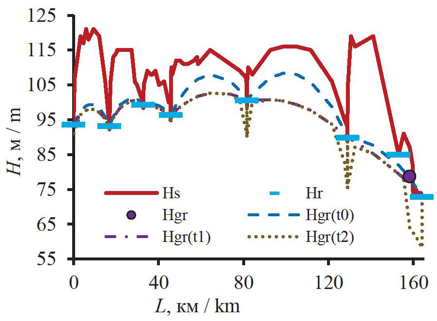 Рис. 4. Профиль AP–OP (рис. 1, b) и уровни подземных вод в голоцене: Hs – поверхность водосбора или дна рек; Hr – современный среднемноголетний уровень речных вод; Hgr – современный среднемноголетний уровень воды в скважине 63р в с. Мельниково; Hgr(t0) – расчетный среднегодовой уровень подземных вод в среднем за 1967–2005 гг.; Hgr(t1) – расчетный уровень подземных вод при условии, что все болота низинного типа, а их площадь в 1,7 раз больше, чем в настоящее время (ориентировочно 1,5…2,0 тыс. лет назад); Hgr(t2) – расчетный уровень подземных вод при условии, что все болота низинного типа с глубиной не более 0,3 м, а их площадь в 2 раза меньше, чем в настоящее время (ориентировочно 4 тыс. лет назад)