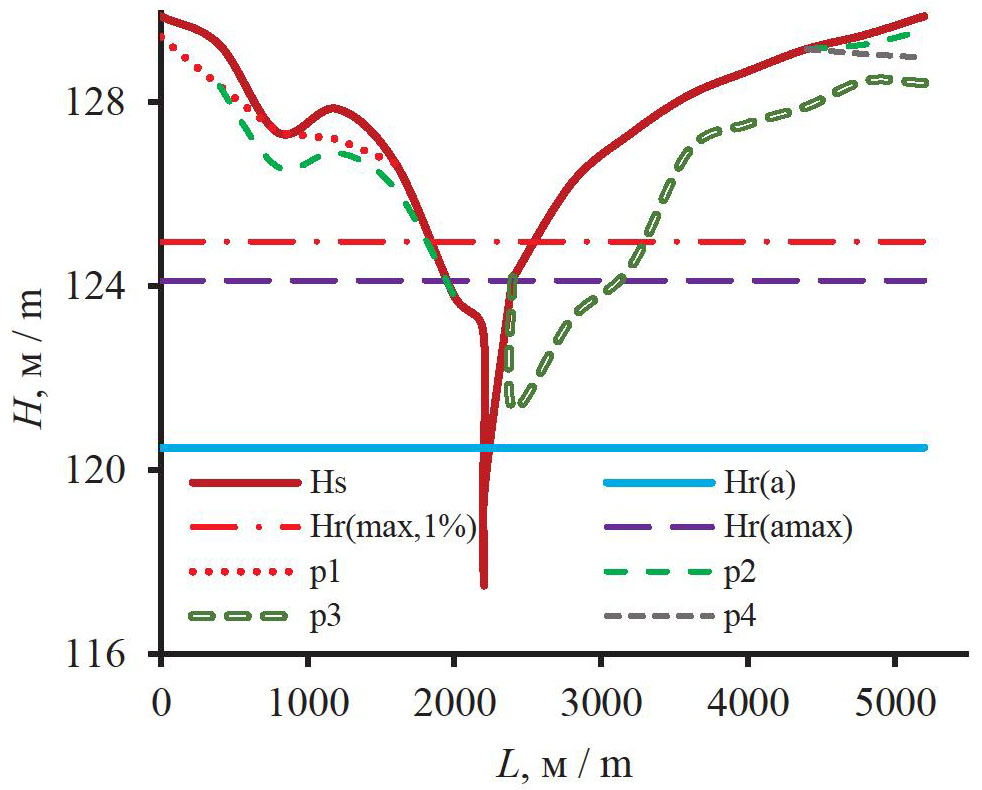 Рис. 5. Поперечный профиль долины р. Бакчар в 87 км от истока; Hs – высотная отметка поверхности водосбора или дна реки; Hr(a), Hr(max,1 %), Hr(amax) – средний годовой, максимальный с обеспеченностью 1 % и средний максимальный уровни воды в р. Бакчар; p – высотная отметка нижней поверхности слоя торфяной залежи с преобладанием торфов верхового сфагново-мочажинного (p1) и низинных осокового (p2), травяного (p3) и березового (p4)