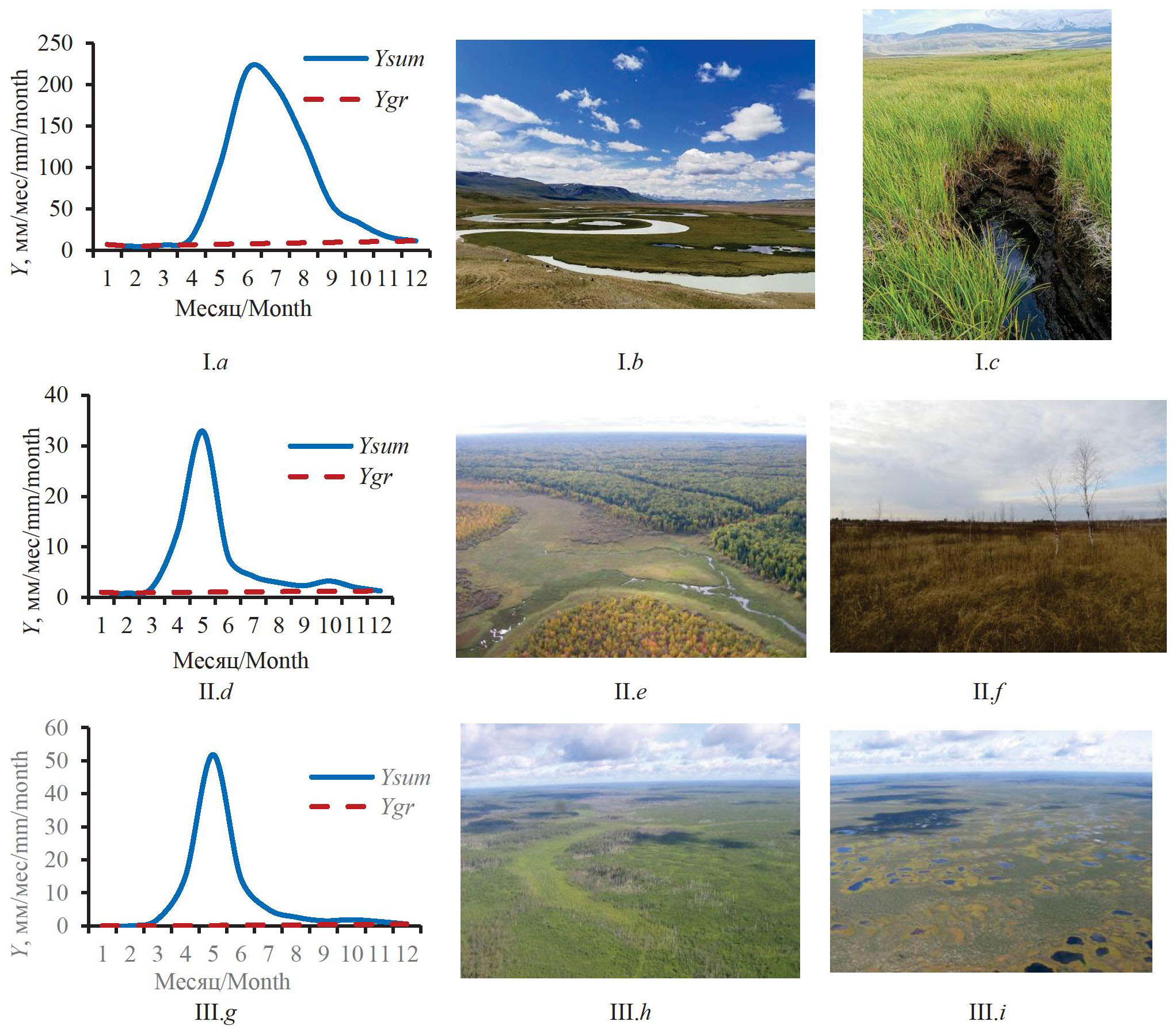 Рис. 6. Типовые гидрографы рек и примеры видов речных и болотных систем на разных этапах болотного процесса: I – начальный этап формирования низинных болот на фоне интенсивных русловых процессов; II – широкое распространение низинных болот; III – широкое распространение верховых болот, формирование вторичной гидрографической сети на болотах; a) гидрограф р. Ак-Алаха у п. Бертек; b) вид долины р. Ак-Алаха на плато Укок, участок свободного и незавершенного меандрирования; c) участок заболоченного лога, который примыкает к р. Аргамджи; d) гидрограф р. Шегарки у с. Бабарыкино; e) вид заболоченной долины притока протоки Карги; f) участок низинного Обского болота у с. Нащеково; g) гидрограф р. Ключ у с. Полынянка; h) вид заболоченной долины притока р. Парабель; i) грядово-мочажинно-озерковый комплекс (верховое болото) в междуречье рек Васюган и Парабель; Y – слой стока, в том числе: Ysum – слой суммарного стока реки; Ygr – слой стока подземной составляющей по формуле (5); фото О.Г. Савичева