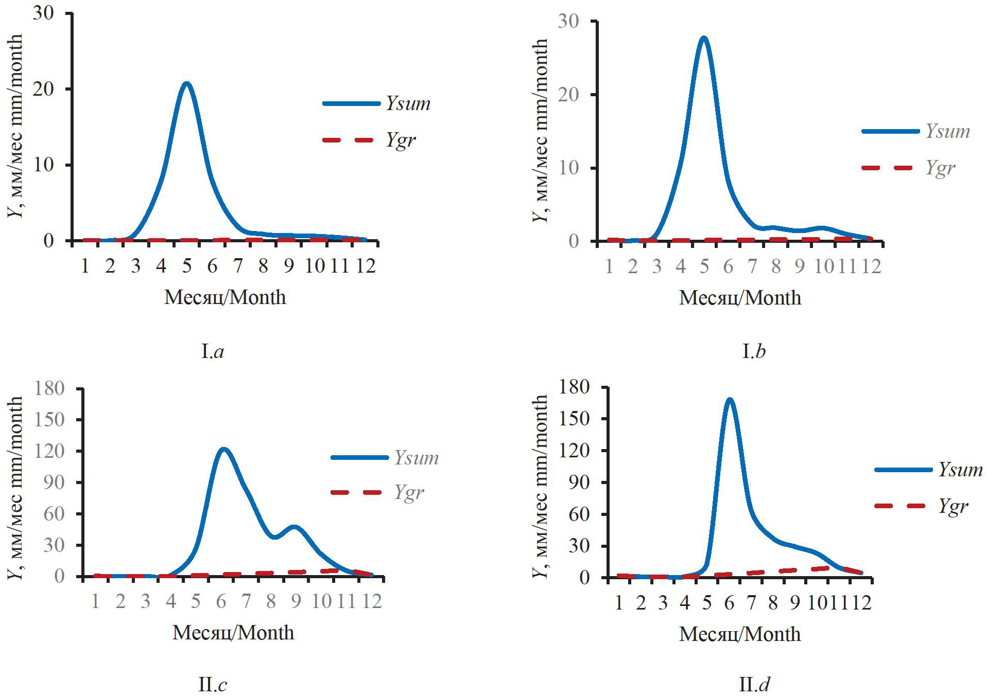 Рис. 7. Типовые гидрографы рек на разных этапах дальнейшего развития болотного процесса: I – потепление с обсыханием болот, их деградацией на водоразделах и сохранением в долинах рек; II – похолодание с формированием (усилением) зоны многолетней мерзлоты; типовые гидрограф: a) р. Каргат – с. Гавриловское; b) р. Омь – с. Крещенка; c) р. Щучья – п. Щучье; d) р. Советская речка – п. Советская речка; остальные обозначения те же, что и на рис. 5