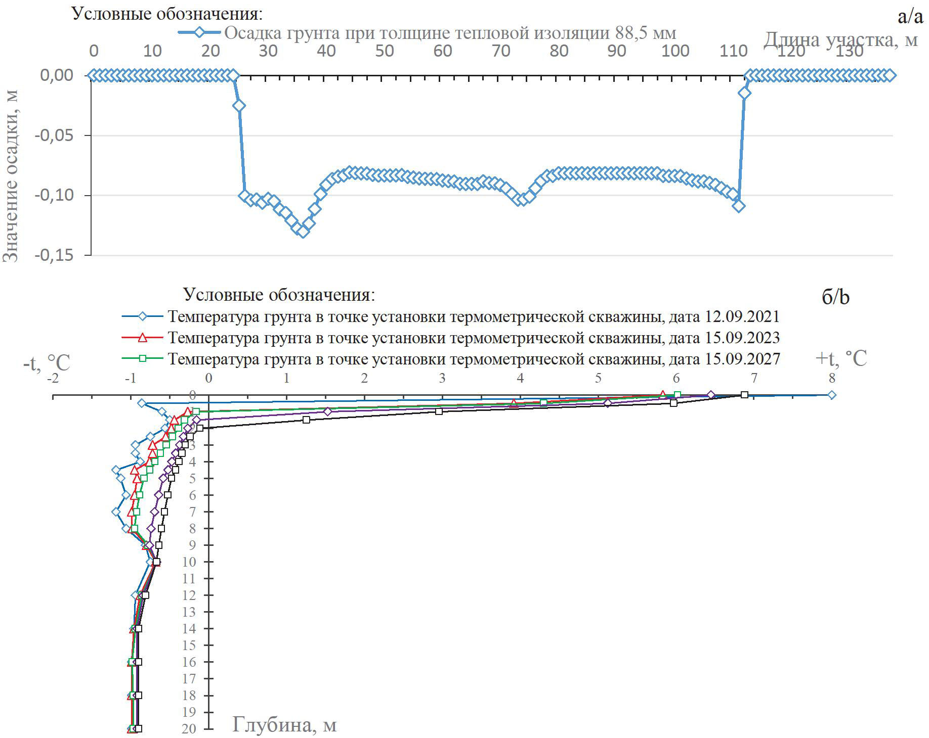 Fig. 2. Results of thermal engineering calculations: a) settlement profile of the design model with a length of 135 m; b) predicted ground temperatures in a thermometric well along the pipeline route