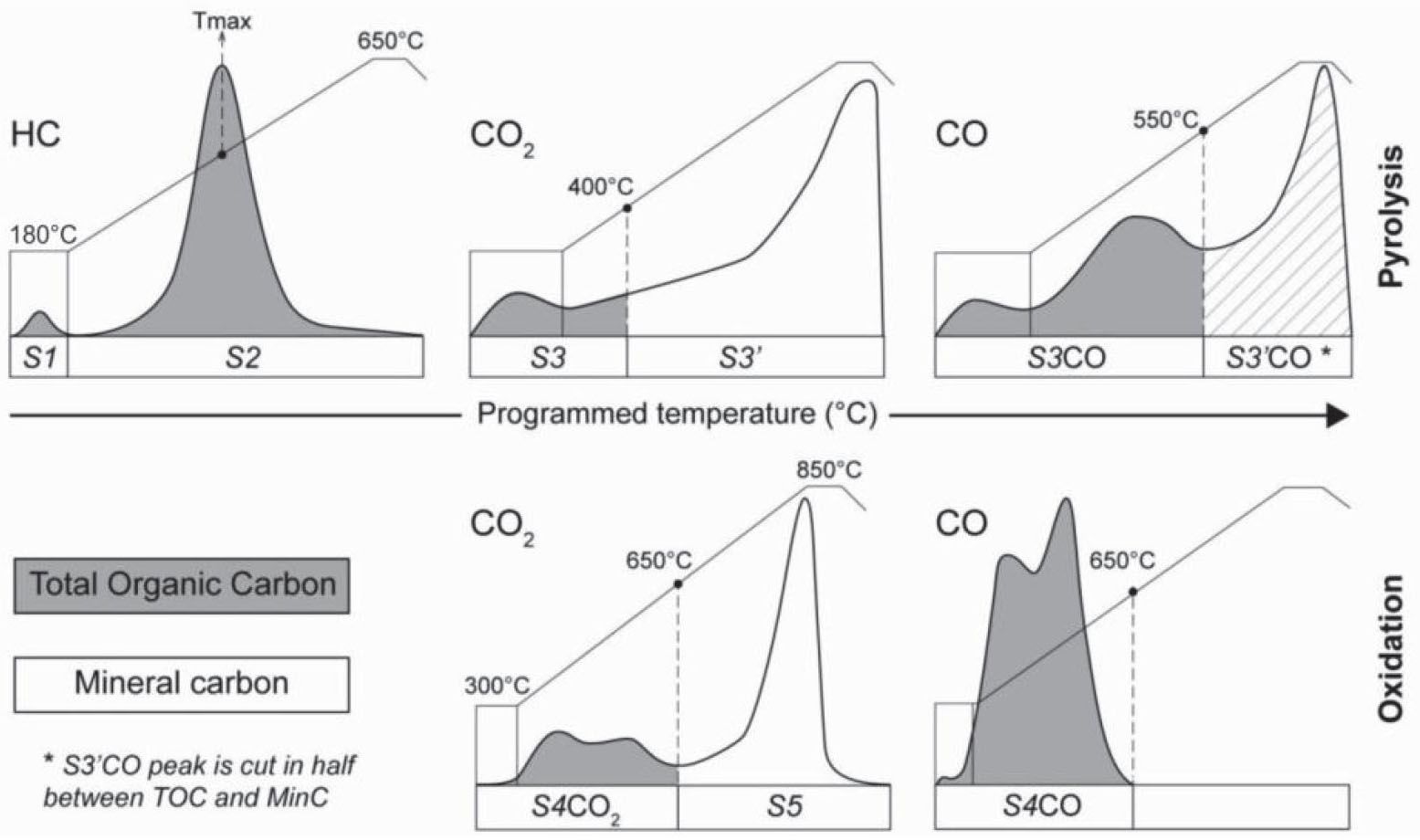 Пиролитический анализ был выполнен на приборе Rock Eval 6 Turbo компании Vinci Technologies, Франция. Данный анализ представляет собой двухступенчатый процесс, сочетающий пиролиз в кислородной атмосфере и сжигание в кислородных условиях. Пробоподготовительные работы проходили в несколько этапов, на начальном этапе пробы размораживались при комнатной температуре, далее высушивались и гомогенизировались в фарфоровой ступке. По итогу навеску породы (донный осадок) массой 40 мг анализировали в температурном цикле «Reservoir» (рис. 2). Процедура начиналась со 180 °C со скоростью нагрева 25 °C/мин для высвобождения фракции легких летучих соединений и формирования пика S1r (мг УВ/г). Дальнейший нагрев до 650 °С позволяет получить двойной пик S2a (мг УВ/г) и S2b (мг УВ/г), в значительной степени указывающий на распад сложных молекул [15, 19]. Выделившиеся углеводороды измерялись пламенно-ионизационным детектором. Количества CO и CO2, представляющие пики S3CO (мг CO/г) и S3 (мг CO2/г), соответственно, непрерывно измерялись инфракрасным детектором на стадии пиролиза. Затем образец сжигали в окислительной камере, нагреваемой до 850 °С со скоростью нагрева 20 °С/мин. Эта дополнительная стадия окисления позволила определить значения остаточного органического углерода (RC – Residual Carbon, %) и неорганического углерода (MinC, % масс.). Общее содержание органического углерода (TOC – Total Organic Carbon) рассчитывали как сумму пиролизованной (PC – Pyrolysis Carbon, %) и остаточной фракций. Водородный индекс (HI – hydrogen index) и кислородный индекс (OI – oxygen index) определяются из соотношений S2/TOC и S3/TOC соответственно.