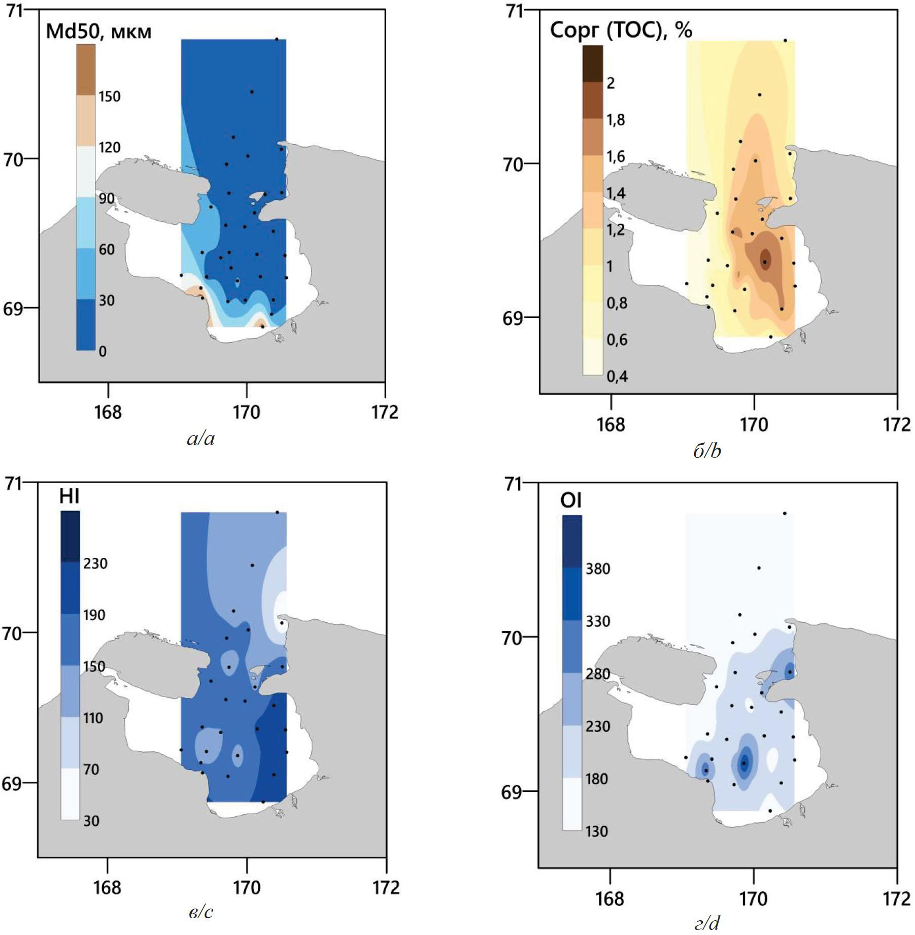 Рис. 3. Карты пространственного распределения: а) медианного размера зерна (Мd50) в донных осадках Чаунской губы (Восточно-Сибирское море); б) органического вещества Сорг (TOC), % в донных осадках Чаунской губы; в) водородного индекса (HI), мг УВ/г Сорг в донных осадках Чаунской губы; г) кислородного индекса (OI), мг СО2/г Сорг