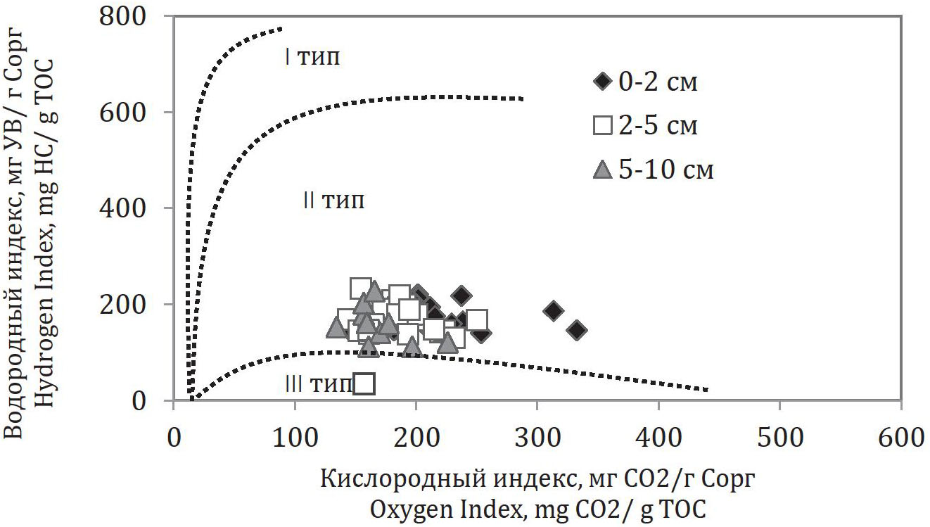 На базе диаграммы Ван-Кревелена мы построили модифицированную диаграмму зависимости HI от OI индексов для уточнения генезиса Сорг. Данная диаграмма традиционно используется в нефтяной геохимии с целью типизации керогена в соответствии с генезисом исходного Сорг. Согласно представленной диаграмме, I тип характерен для морского Сорг, II тип – для смешанного Сорг и III тип – для терригенного Сорг [18] (рис. 4). Значения HI и OI преимущественно попадают в область, относящуюся ко второму типу, отвечающему за смешанный генезис Сорг. Несколько станций попадают или граничат с третьим типом, однако мы считаем, что для донных осадков Чаунской губы характерно наличие смешанного типа Сорг. Это также подтверждает выводы, представленные выше.