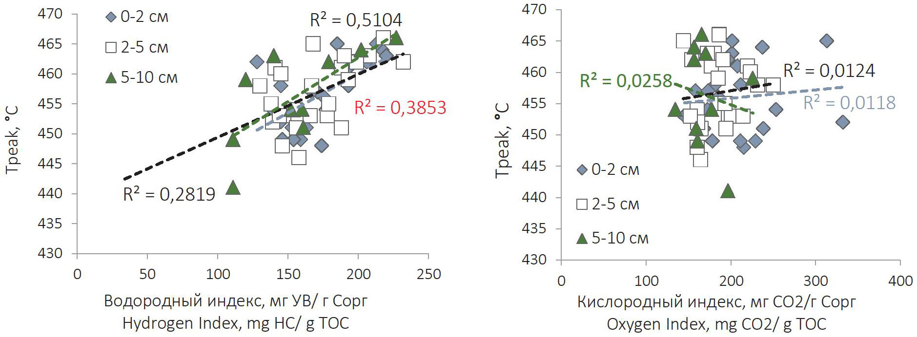 Значения Tpeak для донных осадков исследуемого района находятся в диапазоне от 441 до 647 °C при среднем значении 460±26 °C, что определяется наличием более термически-устойчивой гумусовой компоненты. Наши данные значительно отличаются от данных для центральной и северо-западной частей шельфа ВСМ [18], где значения Tpeak не превышают 400 °C. На левом графике рис. 5 мы наблюдаем положительную корреляцию между Tpeak и значениями HI для всех трех горизонтов. Особенно высокая корреляция наблюдается для нижнего горизонта (R=0,72 при достоверности аппроксимации R2=0,51) и поверхностного горизонта (R=0,62 при достоверности аппроксимации R2=0,38), что потенциально указывает на присутствие термически устойчивой морской компоненты в составе Сорг донных осадков Чаунской губы. На правом графике корреляционная связь между Tpeak и значениями OI полностью отсутствует.