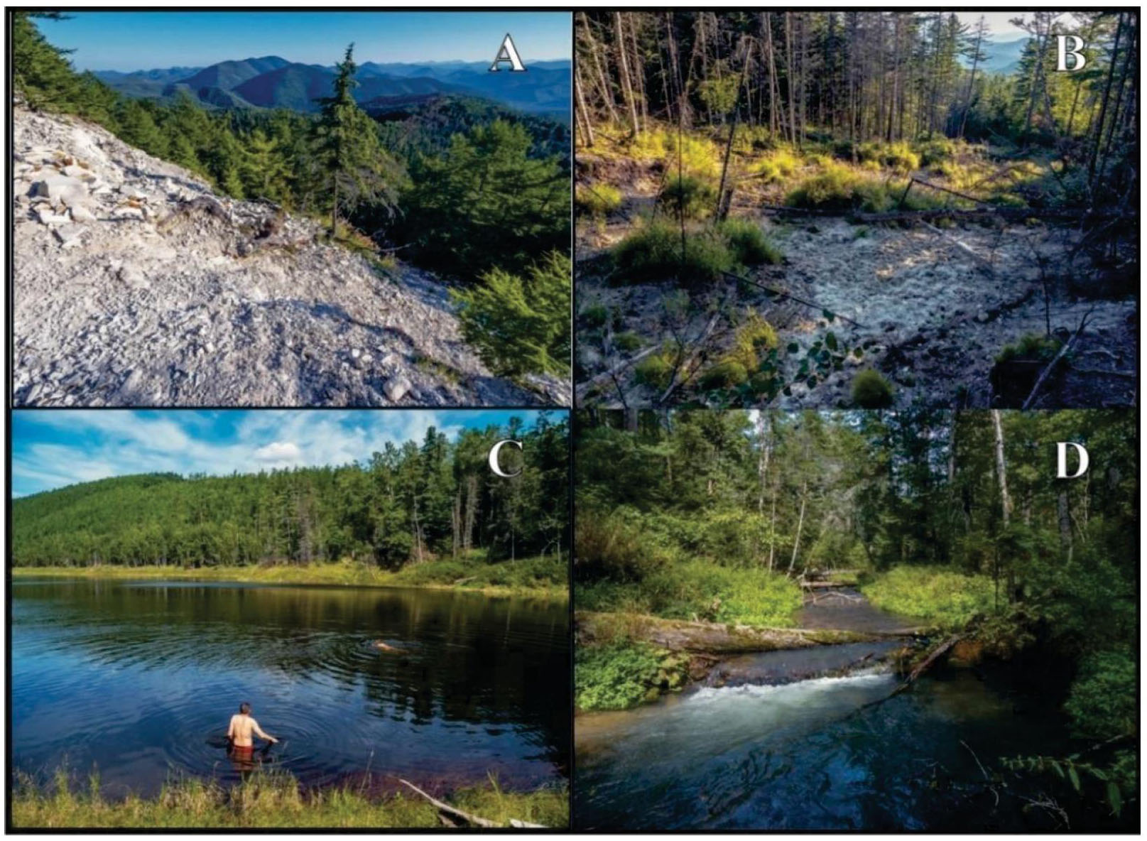 Fig. 2. А, В – fragments of salt licks-kudurs in the area of Solontsovaya Mountain; C – the largest of Shandui lakes – Bolshoe Solontsovoe; D – typical view of Samarkin brook
