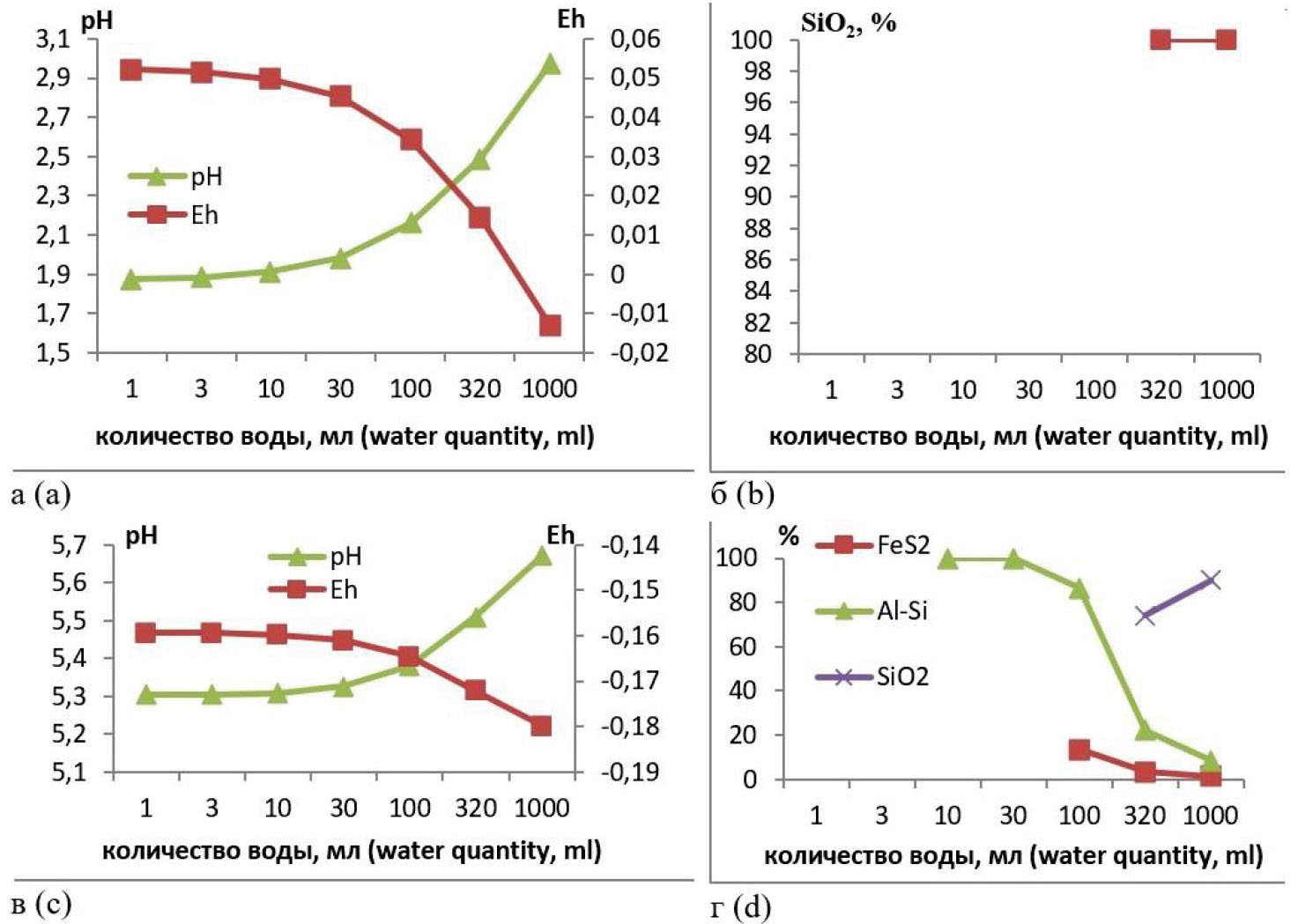 Рис. 4. Изменение параметров системы рН, Eh (а, в) и образование твердых фаз (б, г) при изменении объёма воды в системе «вода – желудочный сок». Объем желудочного сока VЖС=100 мл, Т=+38 °C, P=1 бар. Al-Si – алюмосиликаты. при начальных значениях ЖС: рН=6,24, Eh=–0,218 В, С(НCl)=2284,6 мг/л