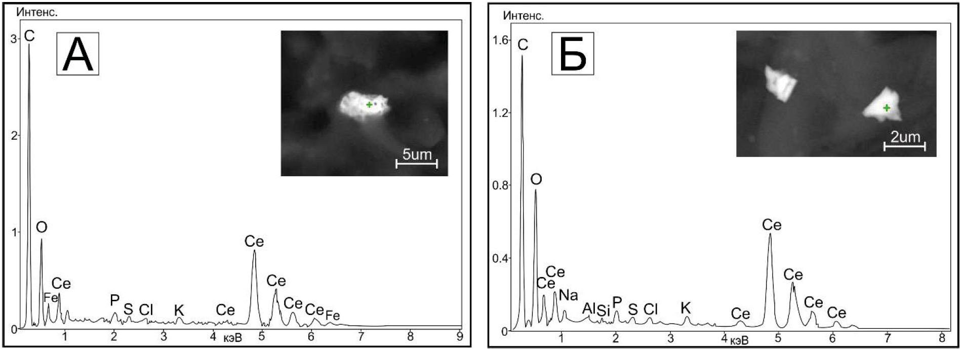 Рис. 8. Церий-содержащие минеральные фазы в головном мозге изюбря и их состав