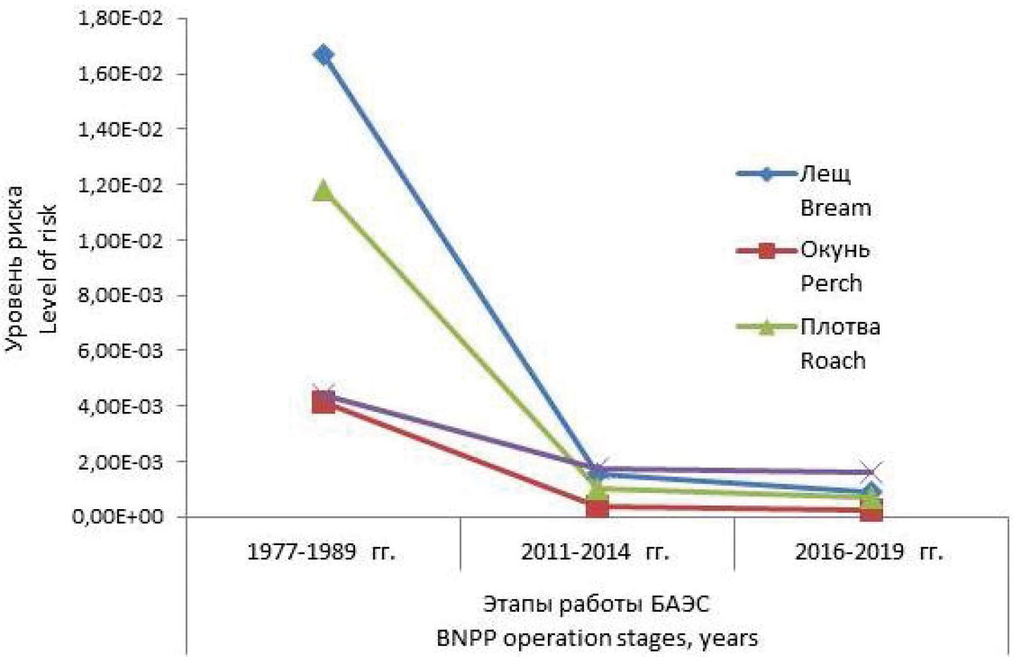 Формирование радиационных рисков у ихтиофауны водоема-охладителя ЛАЭС в период 1973–1985 гг. было в значительной степени связано с присутствием в водоеме радиоизотопов с наведенной активностью (60Co, 54Mn и 65Zn), образование которых может быть следствием работы ядерных реакторов АЭС. В период 1986–1990 гг. экологические риски у ихтиофауны Копорской губы были в основном вызваны последствиями радиационной аварии на Чернобыльской АЭС и загрязнением водоема 137Cs. В последние годы (2000–2019 гг.) радиационные нагрузки на ихтиофауну вызваны сочетанным воздействием радиоцезия и радионуклидов с наведенной активностью (14C; 60Co; 3H, 54Mn и 65Zn) при доминировании последних в процессе формирования суммарного экологического риска.